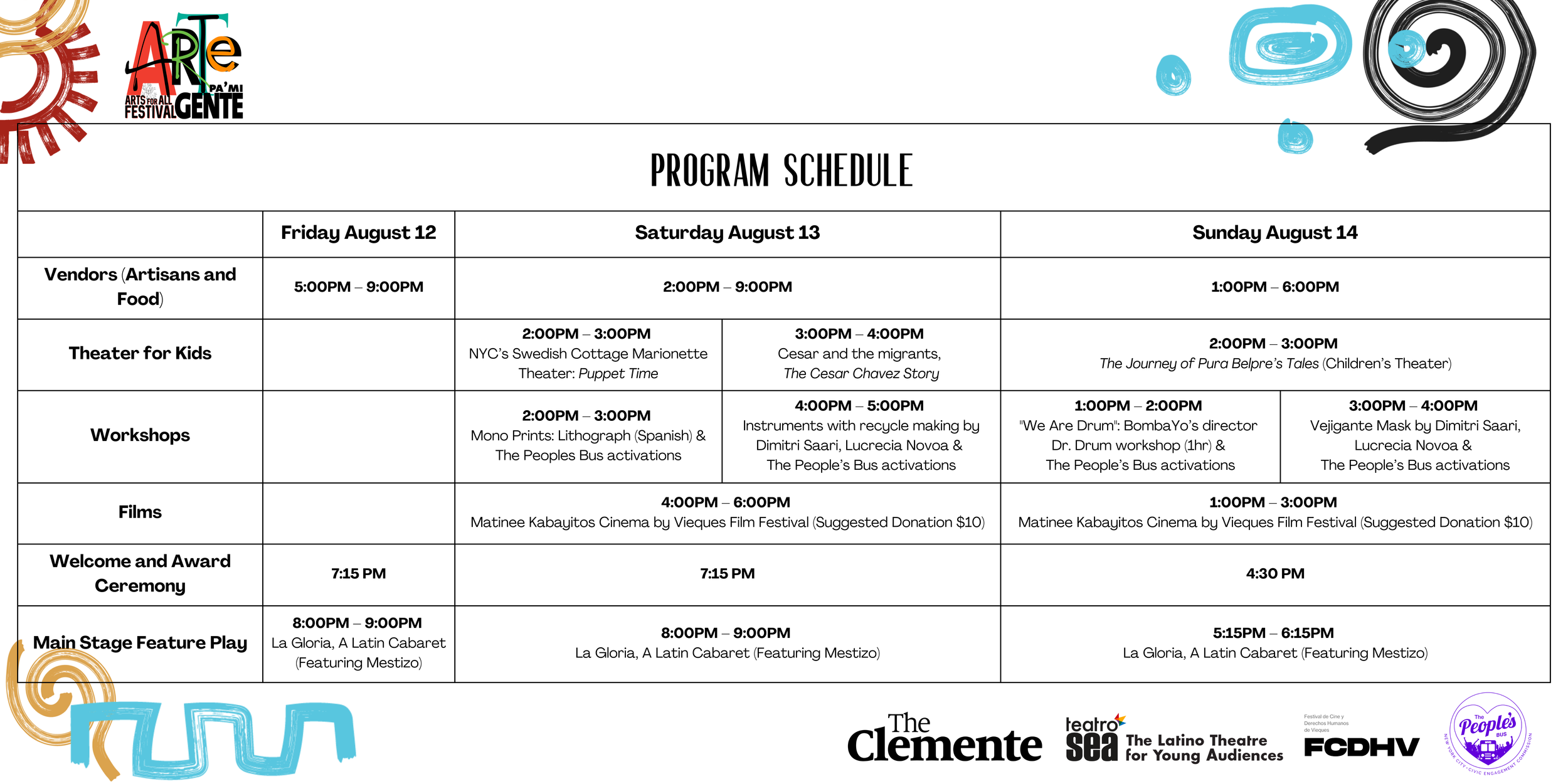 Arte Pa'Mi Gente Festival, co-presented with Teatro SEA, will be taking place from August 12-14 in La Plaza at The Clemente.