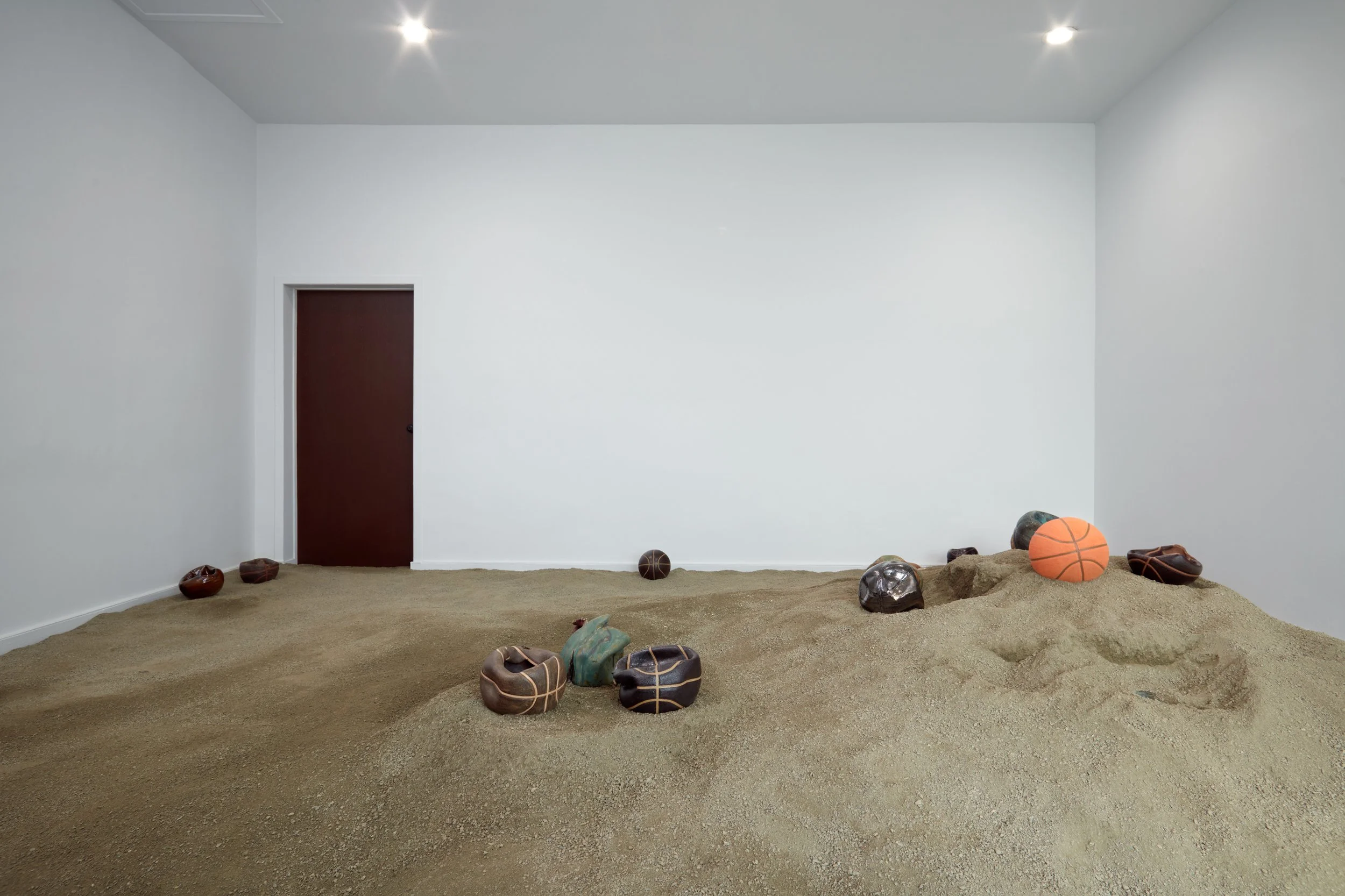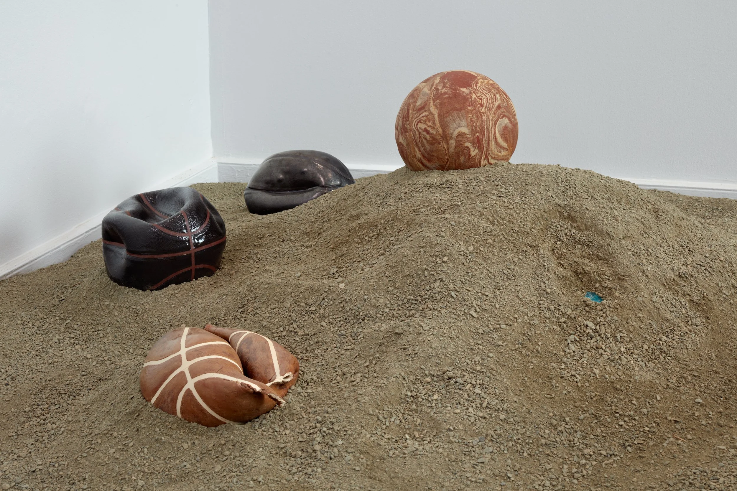 Installation shots of the exhibition Be True To The Game. Construction-grade sand and ceramic, 2024.