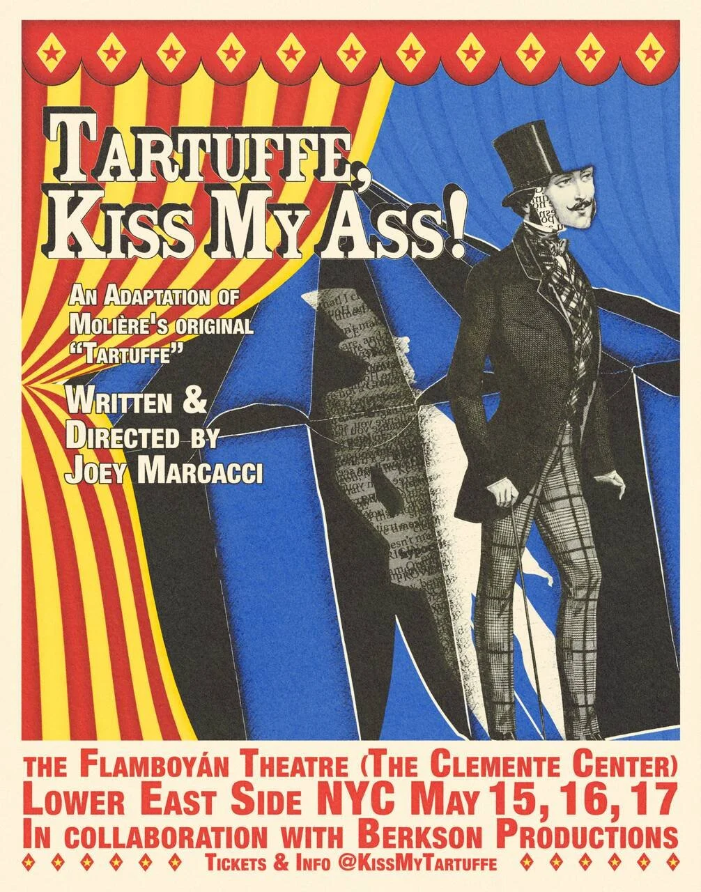 Inspired by the guts Moliére possessed in a time of expressive restriction and absolutism, Joey wrote Tartuffe, Kiss My Ass! exploring modern day imposters, the idea of ‘inferiority’, and what it means to disguise it. For the adaptation, in addition to the original text, he drew inspiration from commedia dell’arte, clowning, burlesque, vaudeville, and ballroom culture.