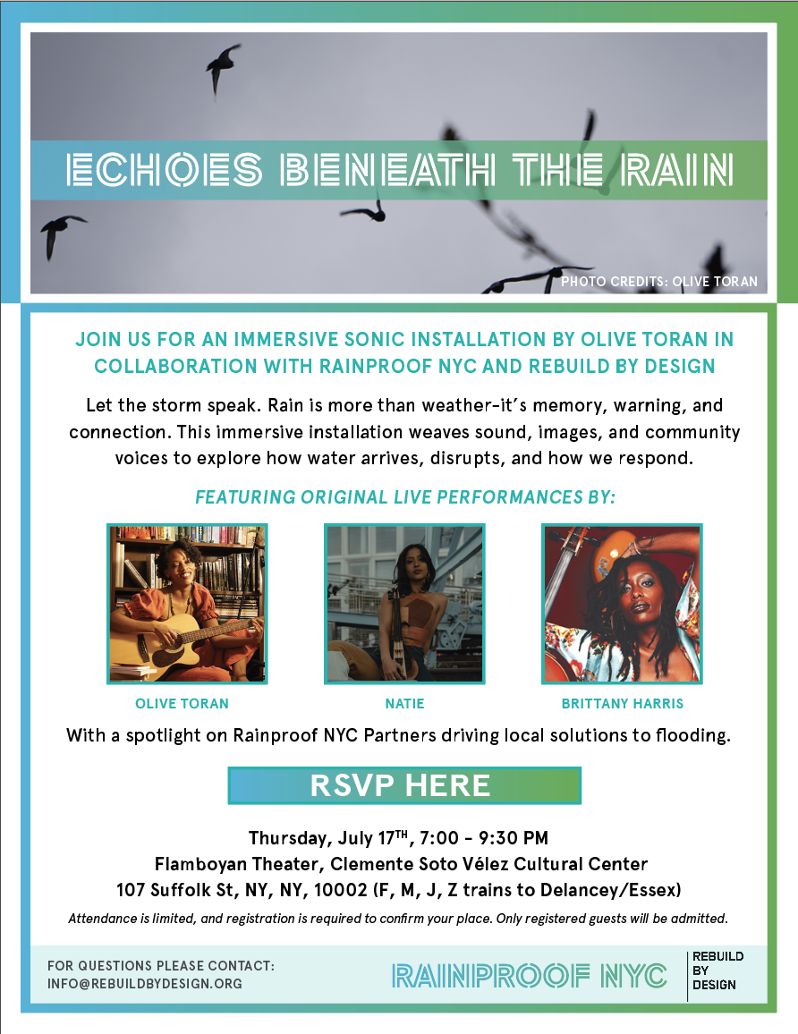 Join us for an immersive sonic installation by Olive Toran in collaboration with Rainproof NYC and Rebuild by Design.