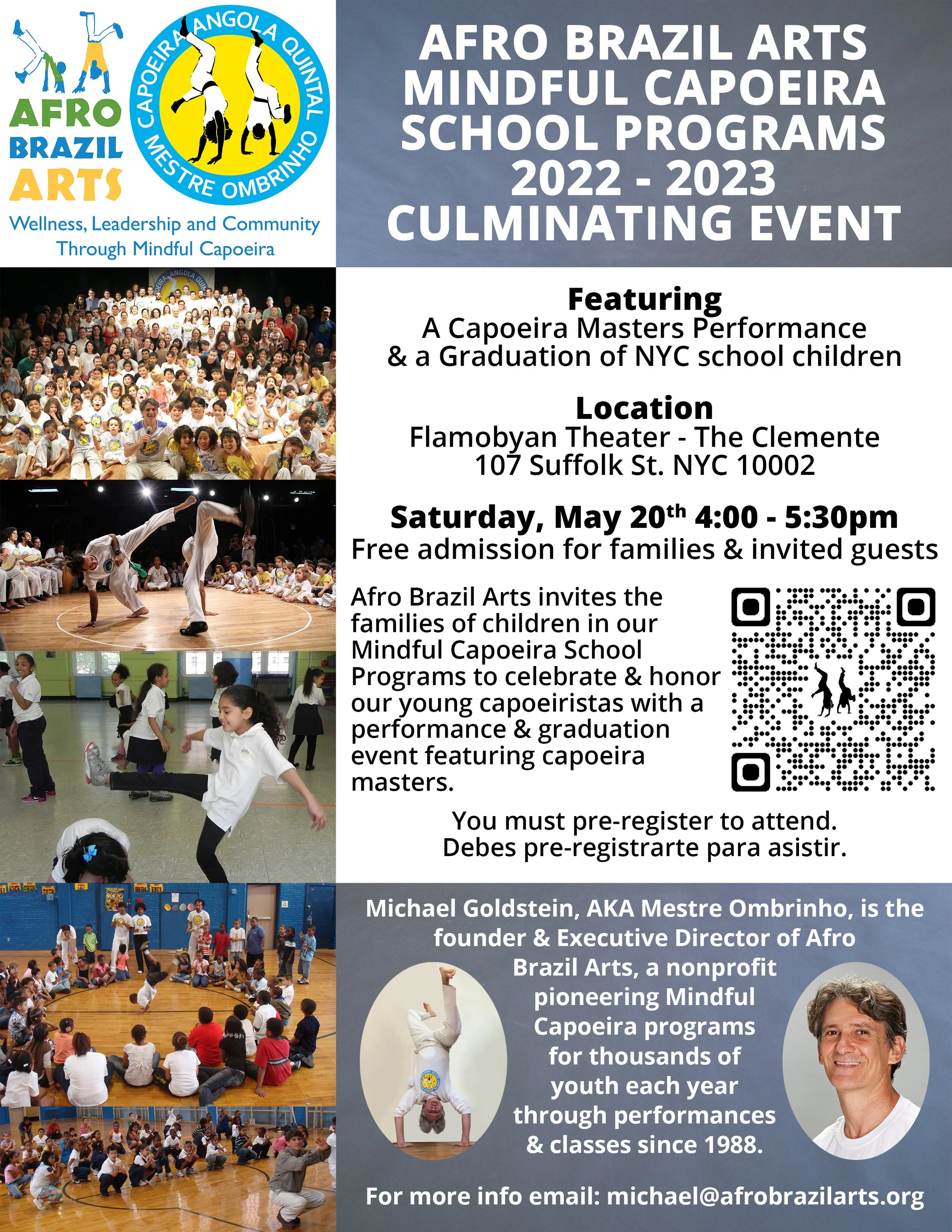 Afro Brazil Arts invites the families of children in our Mindful Capoeira School Programs to celebrate and honor our young capoeiristas with a performance and graduation event featuring Capoeira masters.