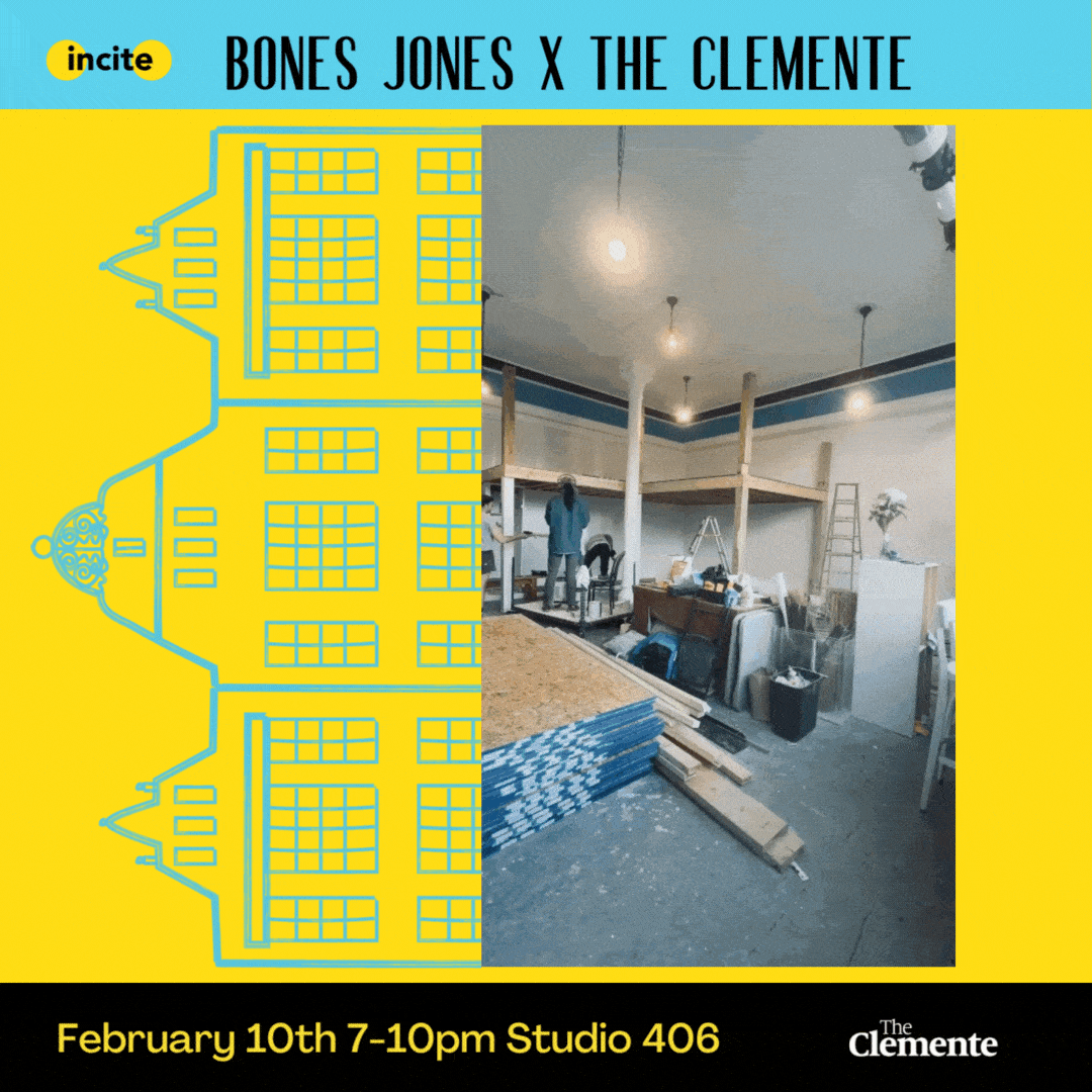 Logic(s) magazine Designer in Residence Bones Jones will be Incite’s inaugural artist in residence at The Clemente and will cultivate a space that unites Incite and The Clemente. Jones, through his brand House ° Bones, strives to provide a platform and spaces where everyone can find connection and their unique expression.